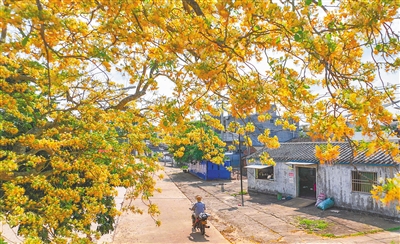 近日,澄迈县大丰镇才存村一株赤果鱼木树迎来盛花期。满树金黄花朵竞相绽放,宛如为大树披上璀璨的“黄金甲”,在阳光下熠熠生辉。该村的赤果鱼木树已经成为“网红树”,每年花期都引得游客慕名前来观赏。