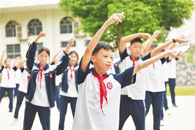 近日,屯昌县“非遗进校园”活动启动,全县27所中小学开展盅盘舞学习课程。盅盘舞是海南省省级非物质文化遗产,以盅、盘、筷、匙为道具,通过生、旦、丑三个角色的生动演绎,形成了独具特色的舞蹈语言。图为屯昌中学学生跟着老师学习盅盘舞。