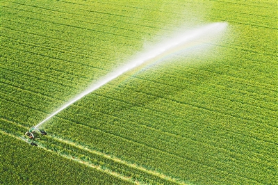 5月7日,一台自走式喷灌机在河南省焦作市温县黄庄镇南韩村麦田间作业。 新华社发