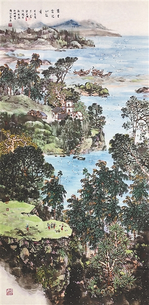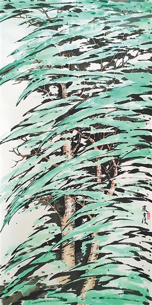 海南画家群体扎根海南自贸港建设实践,将时代精神融入创作。曾祥熙的《山色有无处》以虚实相生的笔法,在传统美学意境中注入当代审美意识;陈茂叶的《乡情》用大写意表现手法,淋漓尽致地展现了海岛情韵;吴东民的《湖岸春野》则以书入画,用苍茫的笔力描绘琼岛春色;阮江华的《万里春光山海秀》创新性地将青绿山水技法与现代构成理念结合,以宏大构图与绚丽色彩展现海南的发展气象。