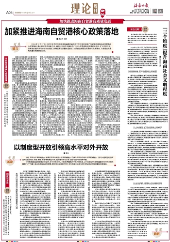 2024年12月17日,习近平总书记在听取海南省委和省政府工作汇报时强调,“加紧推进海南自由贸易港核心政策落地,精心做好各项准备工作,确保封关运作平稳有序。”2025年是海南自贸港封关运作、扩大开放之年,须精准把握开放与安全的协调性,统筹速度与质量的适配性,加紧推进海南自贸港核心政策落地,为海南自贸港高质量发展集聚新动能。