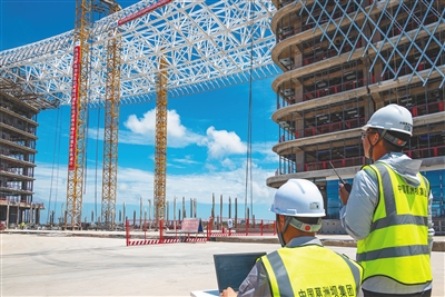 5月17日,文昌国际航天城航天科创基地项目完成钢结构桁架提升安装。海南日报全媒体记者 袁琛 通讯员 胡骏一 摄