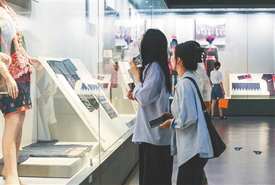 五月十八日,游客参观位于五指山市的海南省民族博物馆黎族织锦和苗族刺绣实物陈列。(省民族博物馆供图)