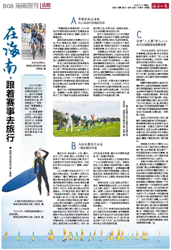■ 海南日报全媒体记者 王黎刚5月19日是中国旅游日,这几年,体育和旅游密不可分。高水平体育赛事能吸引眼球,海南是旅游大省,很早就提出了“体育+旅游”“跟着赛事去旅行”的理念。