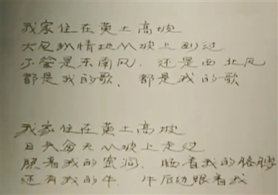 初冬的一天,雁北寒风凛冽,陈哲听到了西北风的呼啸,那些早就酝酿于心中的词句再也压抑不住了,他挥笔写下了“我家住在黄土高坡,大风从坡上刮过”,紧接着,歌词便一句接着一句地蹦了出来,很快,陈哲便完成了这首歌的歌词创作,歌词写在了纸上,也写在了中国人的心里。