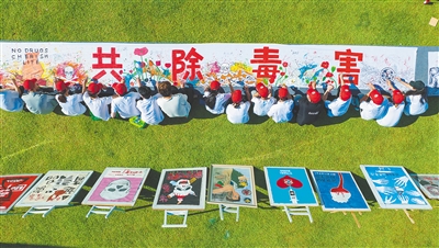 在海口市万绿园,学生代表画漫画,通过绘画形式宣传、参与禁毒,为禁毒工作贡献青春力量。阮琛 摄