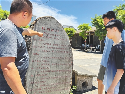 美社村村民在刻着“严禁贩毒吸毒涉毒”的村规民约碑前,教育年轻人要远离毒品。悦光 摄