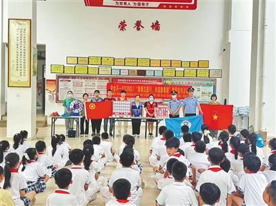 在禁毒宣教活动中,三亚戒毒所民警向学生发放禁毒宣传折页。资料图