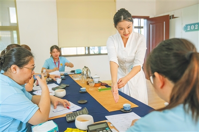 5月20日,2025年海南省茶业行业职业技能竞赛在琼中黎族苗族自治县收官。图为在茶汤质量比拼项目中,茶艺师请评委品茶。