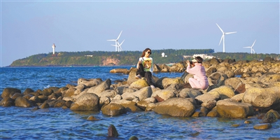 在儋州市峨蔓镇火山海岸地质公园,游客在欣赏风车落日美景。海南日报全媒体记者 陈元才 摄
