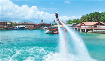 近日,在陵水黎族自治县分界洲岛景区,游客在体验水上游乐项目,在炎炎夏日中尽享海上“清凉”。