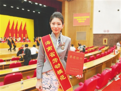 海南航空乘务员曲桂庆获“海南省劳动模范”荣誉称号。