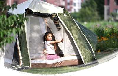 6月2日,在天津市西青区中北镇花海花田,小朋友在帐篷里玩耍。新华社发