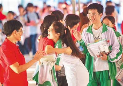 6月7日,琼海市嘉积中学考场,考生进场前与送考老师热情拥抱、击掌。