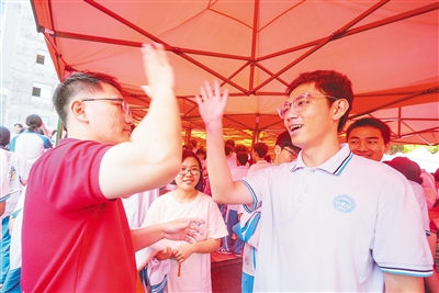 ①6月7日,在海南中学高中部考点,老师和考生一起加油鼓劲。