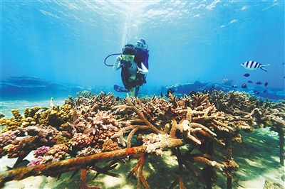 阳光的映照下,新生的珊瑚苗与蓬勃的珊瑚林共同静卧海底,承载着人们对恢复蔚蓝生机的共同期待。