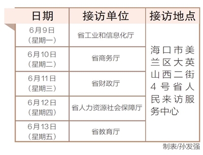 6月9日至13日,省工业和信息化厅、省商务厅、省财政厅、省人力资源社会保障厅、省教育厅相关负责人将在海口市美兰区大英山西二街4号省人民来访服务中心接访群众。