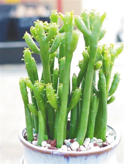 光棍树形态非常特殊,枝条呈碧绿色,犹如一根根小木棍,光滑有光泽,高度一般在三四十公分左右,以直立的形态存在,所以赋予了光棍树这个名字。光棍树的毒素全部储存在汁液中,随便割开它的枝干,或者把它的叶片掰开,就会渗出乳白色的液体。这些汁液有毒,如果触碰到皮肤就容易红肿,如果皮肤有伤口,还会出现瘙痒、灼伤等感觉,如果不小心弄到眼睛里,严重的话还会导致永久性失明。