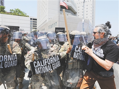 6月8日,在美国加利福尼亚州洛杉矶市中心的联邦执法机构门前,抗议者与国民警卫队人员发生冲突。新华社发