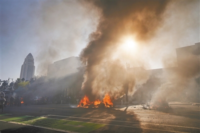 6月8日,在美国加利福尼亚州洛杉矶联邦拘留中心附近的冲突现场拍摄的燃烧的车辆。新华社/美联