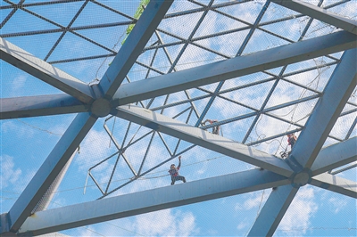 6月10日上午,三亚凤凰国际机场三期改扩建项目施工现场,工人们在屋面进行吊装焊接钢结构作业。目前,该项目核心工程T3航站楼正在加快金属屋面装饰面层、幕墙等施工,计划今年底完工。据悉,该项目投用后,凤凰机场年旅客吞吐量保障能力将提升至3000万人次。