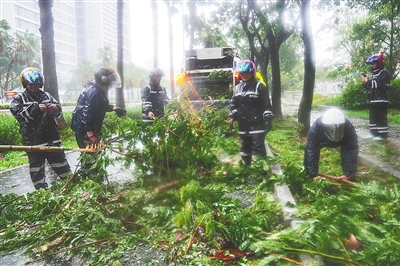 6月13日,台风“蝴蝶”掠境,在三亚市迎宾路上,园林工作人员清理树枝。海南日报全媒体记者 王程龙 摄