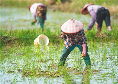 6月15日,琼海市万泉镇农民在田间补栽秧苗。随着台风“蝴蝶”对海南的影响解除,琼海农民抢抓晴好天气,积极开展田间管理,全力保障晚稻生产,为秋粮丰收打下基础。特约记者 蒙钟德 摄