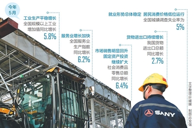 从主要指标看,1至5月份,规模以上工业增加值、服务业生产指数同比分别增长6.3%和5.9%,与一季度相比保持总体平稳。社会消费品零售总额增长5%,比一季度有所加快;固定资产投资增长3.7%,保持基本稳定。我国经济顶住压力实现稳定增长,为下阶段经济稳定运行奠定了坚实基础。