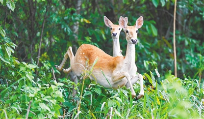 近日,海南坡鹿在海南邦溪省级自然保护区内飞奔。海南坡鹿是国家一级重点保护动物,被世界自然保护联盟列为濒危物种。近年来,通过多方共同努力,海南邦溪省级自然保护区已经成为“绿岛精灵”海南坡鹿生活的美丽家园。据统计,目前海南邦溪省级自然保护区有海南坡鹿200余头。新华社记者 杨冠宇 摄