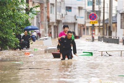 6月24日,在贵州省黔东南州从江县,救援人员将受灾群众转移至安全地带。新华社发