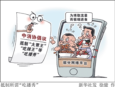 新华社北京6月24日电 (记者赵文君)针对以暴饮暴食、猎奇比拼为特征的所谓“吃播秀”,中国消费者协会6月24日发出倡议,指出为博取流量而极端进食的行为是赤裸裸的食物浪费,呼吁广大消费者不追捧、不点赞、不转发极端吃播内容,主动屏蔽相关账号和频道。中消协指出,当下部分网络平台充斥着大量极端吃播内容,这些内容以挑战人类生理极限的食量,或以猎奇、罕见食材(如超辣食物等)为噱头吸引眼球,不仅严重背离了饮食文化的本真内涵,更造成了令人痛心的食物浪费。此类“吃播秀”,与健康、节约、文明的现代生活理念背道而驰,不仅是对中华民族勤俭节约传统美德的公然践踏,也违反了《中华人民共和国反食品浪费法》的相关规定。