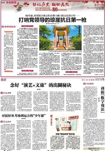 ■ 海南日报全媒体记者 王才丰海口市云龙镇玉仙村有一个令琼崖人民难以忘却的红色坐标——赤柱黄瓦的潭口渡口阻击战纪念亭。这座2004年落成的六角亭是潭口渡口阻击战唯一的纪念性建筑物。