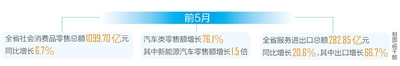 对外经济方面,服务进出口快速增长。1月至5月,全省服务进出口总额282.85亿元,同比增长20.6%,其中出口增长66.7%。同时,金融存贷总额稳定增加,5月末,金融机构本外币贷款余额同比增长5.8%,存款余额同比增长7.5%。