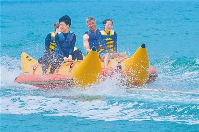 6月26日,三亚市亚龙湾旅游度假区,游客体验水上游玩项目,享受热带海洋风光。