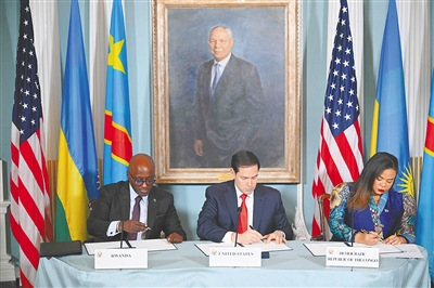 6月27日,在美国华盛顿,卢旺达外交与国际合作部长恩杜洪吉雷海(左)、刚果(金)国务部长兼外交部长瓦格纳(右)和美国国务卿鲁比奥签署和平协议。新华社/法新