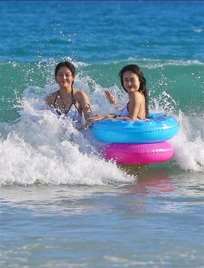 图❶市民游客在三亚大东海旅游区游玩嬉水。