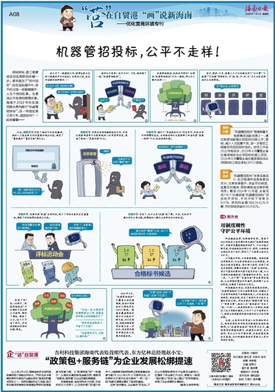 科技赋能监管,创新推动改革。海南于2022年起在全国范围内率先推行“机器管招投标”,并推动其覆盖领域持续扩大、平台功能不断完善,促进招投标过程公开、透明,让招投标过程在阳光下运行,得到了广大经营主体的充分认可。