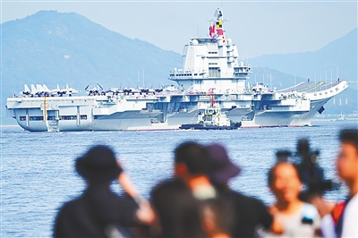 7月3日,人们在岸上拍摄海军山东舰抵达香港。
