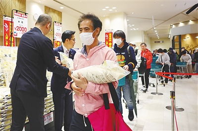 5月31日,日本东京一家超市里,顾客排队购买政府储备米。新华社发