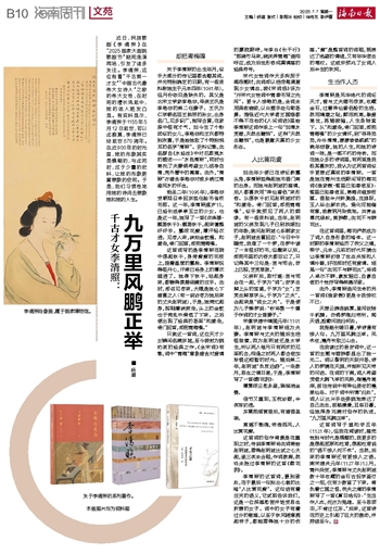 这首词写于宣和辛丑年(1121年),但我在阅读时,感觉性别与时代是模糊的,我更多的是想起屈原和杜甫,想起杜甫说的“语不惊人死不休”。当然,后来的李清照还有更惊人之语。南宋建炎元年(1127年)12月,青州兵变,李清照与丈夫赵明诚数十年收藏的金石古玩字画付之一炬,仅有少数留了下来。背负着亡国之恨、丧夫之痛的李清照写了一首《夏日绝句》:“生当作人杰,死亦为鬼雄。至今思项羽,不肯过江东。”后来,这首诗在历史上引起了巨大的轰动,并持续至今。