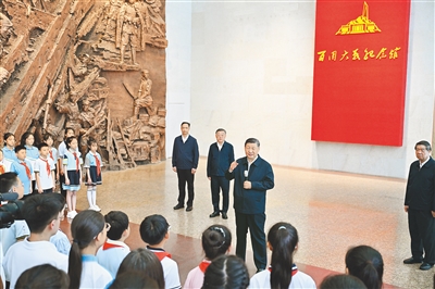 在纪念馆大厅,习近平同前来参观的青少年学生和纪念馆工作人员亲切交流。他说,88年前的今天发生的“七七事变”,是中华民族全面抗击日本侵略者的起点,前事不忘、后事之师,到这里来就是接受精神洗礼。广大青少年生逢其时,要赓续红色血脉,树立强国有我的远大志向,做堂堂正正、光荣自豪的中国人,勇担民族复兴的时代大任。