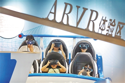 7月12日,在浙江省嘉兴市科技馆,小朋友在体验人工智能ARVR装置。