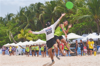 7月12日至13日,2025年世界沙滩飞盘精英邀请赛在三亚大东海旅游区火热举办。本次比赛吸引了来自中国、菲律宾、新加坡等10余个国家和地区的20支顶尖飞盘队伍同场竞技,为全球飞盘爱好者奉献了一场精彩纷呈的沙滩运动盛宴。图为运动员在比赛中拼抢。