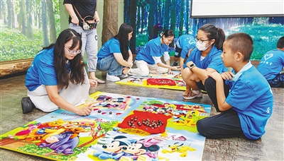 ① 图为青少年在博物馆玩互动游戏“雨林淘金”。