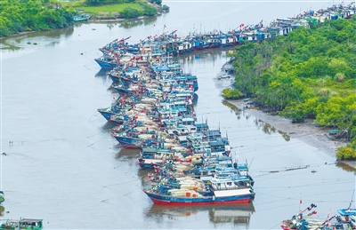 7月19日,台风“韦帕”向琼粤沿海靠近,文昌铺前港的渔船驶入附近的珠溪河避风。