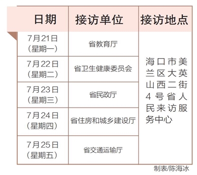 7月21日至25日,省教育厅、省卫生健康委、省民政厅、省住房和城乡建设厅、省交通运输厅相关负责人将在海口市美兰区大英山西二街4号省人民来访服务中心接访群众。