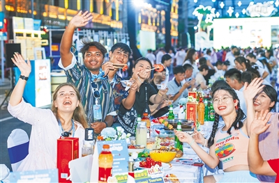 7月19日晚,在2025年“九九杯”海南(文昌)乡镇排球联赛铺前站的糟粕醋长桌宴上,中外游客品尝糟粕醋美食。