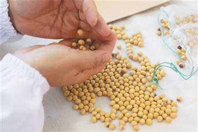 在黑龙江省黑河市五大连池市国家现代农业产业园,工作人员筛选用于育种的大豆(资料图)。
