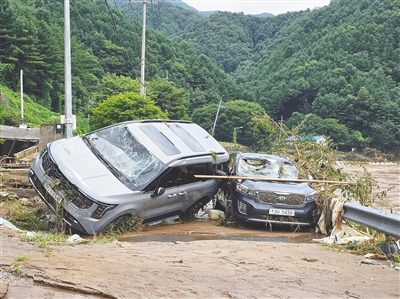 图为7月20日在韩国加平郡拍摄的暴雨后受损的汽车。新华社/法新