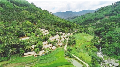 位于海南岛腹地的不少黎族村落,大致沿着山脚处的等高线建房,面朝田野。比如,被誉为“海南第一黎寨”的五指山市毛阳镇初保村,依山势布局,自上而下呈阶梯状分布着十行茅草屋,村前便是一大片梯田。村民用黎语称初保村为“德什龙”,意为“大水田之上的村寨”。